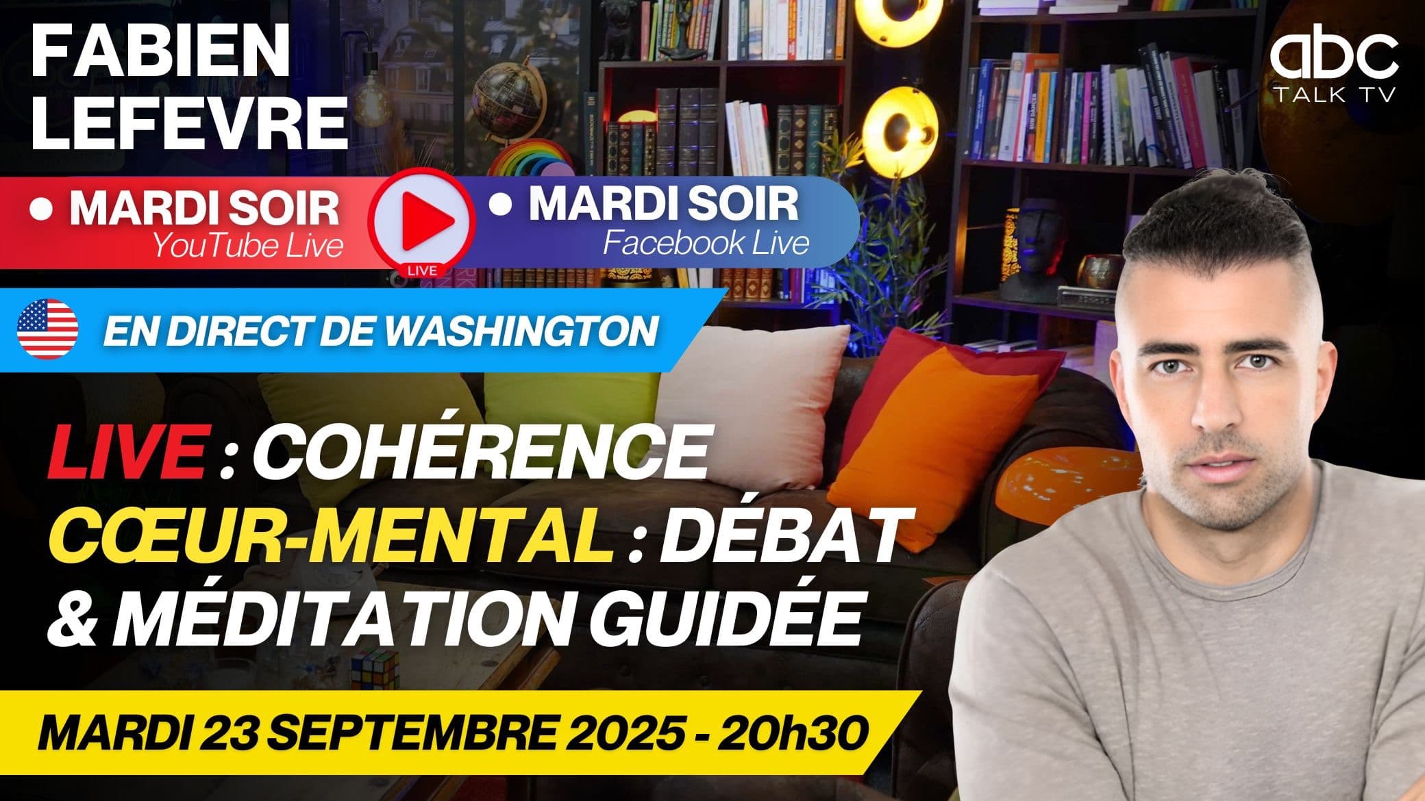 Rejoignez Fabien LEFEVRE en live depuis WASHINGTON pour : Débat et méditation sur la “cohérence cœur-mental” retrouvez ce centrage, cette verticalité nécessaire avant de pouvoir rayonner votre Lumière/Amour.